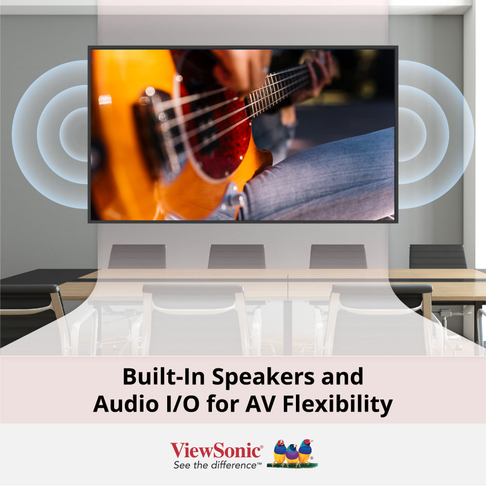 Two integrated 10W speakers deliver clear sound for standalone use in smaller spaces like huddle and meeting rooms. For larger environments or more advanced AV setups, a 3.5 mm audio output enables seamless integration with external audio systems, making it ideal for classrooms, lobbies, and public venues.